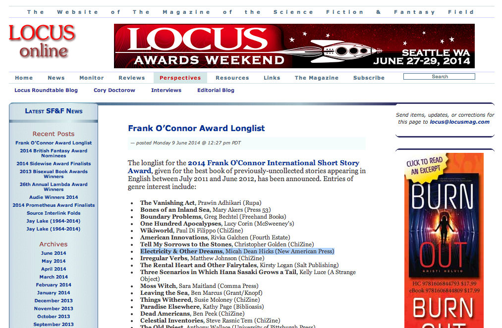 Thanks to Locus Online for mentioning Electricity and Other Dreams as an entry of genre interest in the Frank O’Connor Award!